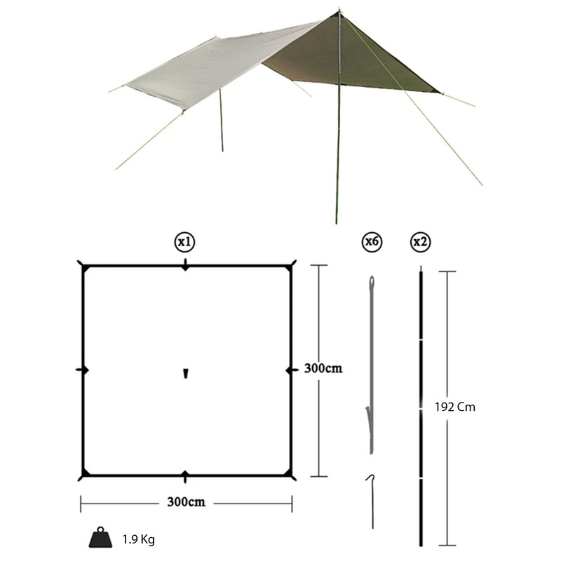 سایبان سفری با حجم و وزن کم، گزینه مناسب برای کمپینگ و سفر است تا شما را در مقابل اشعه خورشید و بارش بارانهای ناگهانی محافظت نماید. این سایبان به اشکال مختلف در طبیعت قابل برپایی است و همچنین از آن میتوان در کنار خودرو نیز برای لذت بردن از سفر و تفریح استفاده نمود. در شرایط خاص از این سایبان میتوان به عنوان چادر اضطراری نیز بهره گرفت. پارچه سایبان از جنس پلی استر با خاصیت آبگریزی و مقاوم در برابر اشعه فرابنفش است تا از شما در مقابل تابش خورشید محافظت نماید. ستون های سایبان از هشت لوله 50 سانتی متری تشکیل شده که قابلیت نصب در ارتفاعهای گوناگون را فراهم میکند. ضمنا با تهیه یک جفت ستون اضافه، میتوان اشکال سایبان با چهار ستون را جهت افزایش سایه بیشتر برپا نمود. این سایبان با وزن 2.2 کیلوگرم به راحتی قابل حمل توسط طبیعتگردان و گردشگرانی است که با اتومبیل، دوچرخه، موتورسیکلت و پیاده سفر میکنند تا در مسیر خود یا در دل طبیعت از این پوشش برای استراحت و در امان ماندن از نور خورشید، باران و حتی برف استفاده نمایند.