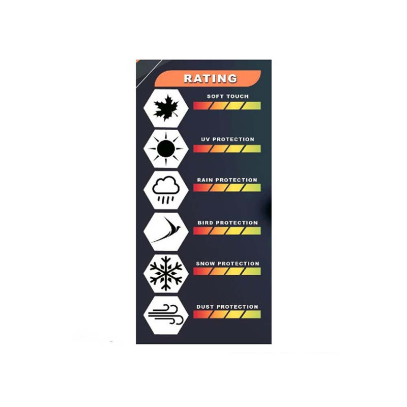 1-مقاوم در برابر اب 2-مقاوم در برابر نور خورشید 3-مقاوم در برابر گرد وغبار 4-دو لایه 5- پشت کورک