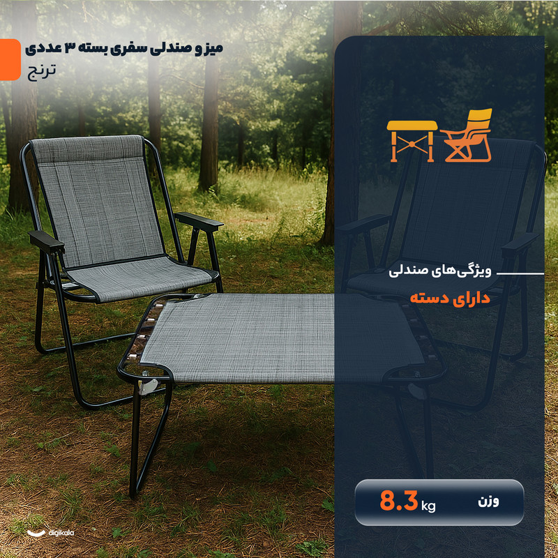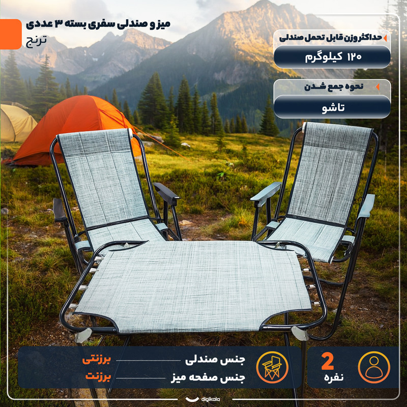 یک نوع میز و صندلی قابل حمل است که برای سفرهای کوتاهمدت، پیکنیک، اردو و کمپینگ مناسب است. این میز و صندلی معمولاً از مواد سبک مانند فلز، پلاستیک، چوب یا آلومینیوم ساخته شده و مجهز به دستگیرههای جانبی و کیف حمل برای سهولت جابهجایی است. با این میز و صندلی مسافرتی، میتوانید در هر مکان به راحتی نشسته و از آن به عنوان میز برای قرار دادن غذا و نوشیدنیها استفاده کنید. انتخابی کاربردی و کمجا برای فعالیتهای خارج از منزل.