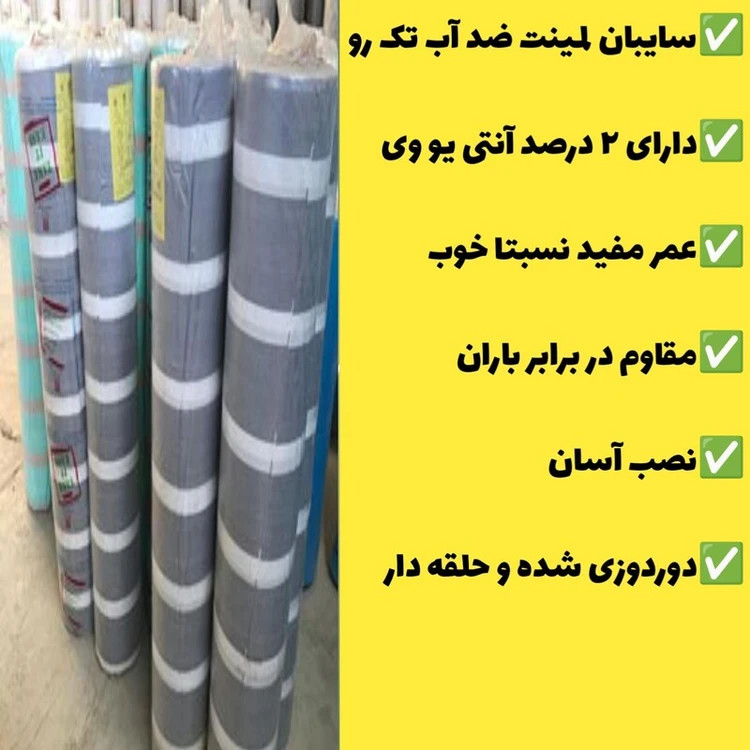 ✅سایبان لمینت ضد آب تک رو ✅دارای ۲ درصد آنتی یو وی ✅عمر مفید نسبتا خوب✅سایبان لمینت ضد آب تک رو ✅دارای ۲ درصد آنتی یو وی ✅عمر مفید نسبتا خوب ✅مقاوم در برابر باران ✅نصب آسان ✅دوردوزی شده و حلقه دار ✅مقاوم در برابر باران و برف ✅نصب آسان ✅دوردوزی شده و حلقه دار