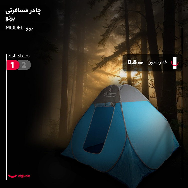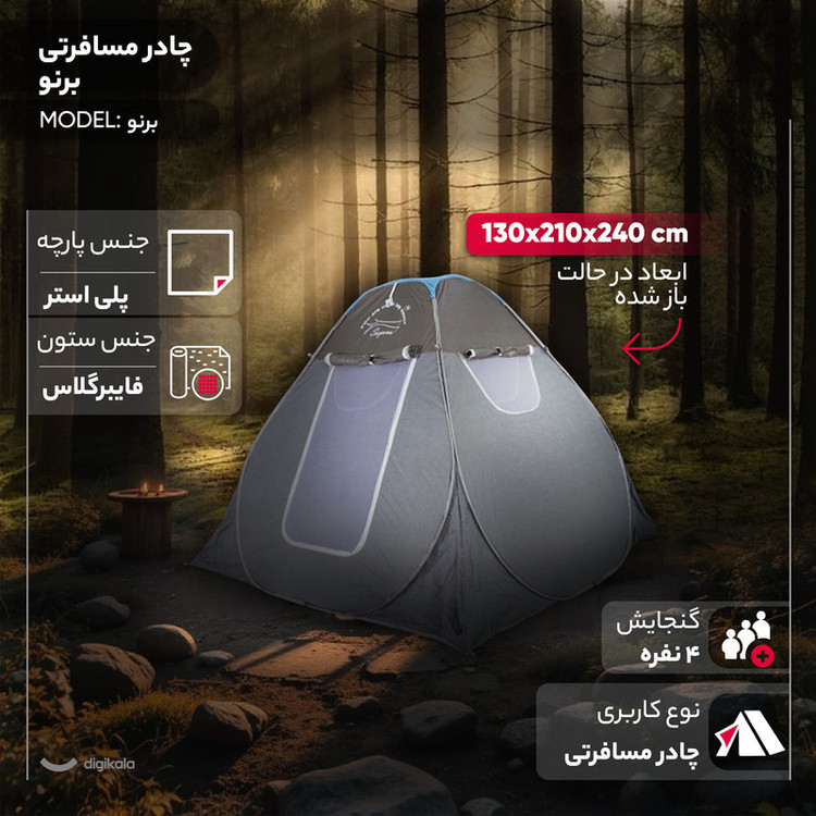 چادر مسافرتی چهار نفره طرح برنو محصولی جدید و خوشساخت است که با ابعاد بزرگ و طراحی کاربردی، راحتی را در سفر برای شما فراهم میکند. این چادر به گونهای طراحی شده که چهار نفر در حالت نشسته و سه نفر در حالت درازکش میتوانند همزمان از آن استفاده کنند و از اقامت در دل طبیعت لذت ببرند. بدنه چادر از پلیاستر باکیفیت ساخته شده و در برابر پارگی و نفوذ رطوبت مقاومت خوبی دارد. پایههای فایبرگلاس بهکاررفته در ساختار آن، انعطافپذیری بالایی دارند و باعث میشوند نصب و جمعکردن چادر بسیار آسان انجام شود. وزن کلی چادر حدود ۸.۶ کیلوگرم است و با وجود ساک حمل مخصوص، جابهجایی آن بدون دردسر انجام میشود. طراحی زیبا، فضای مناسب و کیفیت ساخت بالا باعث شده این مدل به گزینهای ایدهآل برای سفرهای خانوادگی و کمپینگ تبدیل شود.