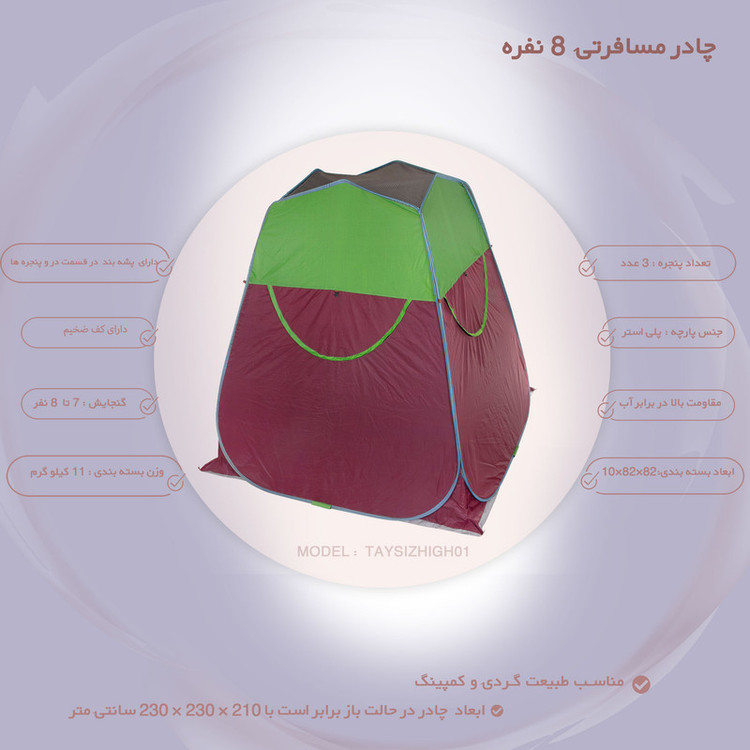 چادر مسافرتی 8 نفره مدل TAYSIZHIGH01 در محیطهایی مانند جنگل، کنار رودخانه، کنار دریا و... میتوان لحظاتی خوش و سرشار از آرامش را تجربه کرد. این چادر دارای ابعاد - ابعاد کالا برابر است با 210 × 230 × 230 سانتی متر بوده و برای هشت نفر قابلاستفاده است. چادر مسافرتی TAYSIZ ازبهترین و باکیفیت ترین پارچه حال حاضر برای دوخت چادر یعنی از پارچه پلی استر و با اسکلت بندی فنری قوی تولید شده است .و ضد آب می باشد .گنجایش چادر 8 نفره ذکر شده ولی طوری طراحی شده که گنجایش تا ده نفر نشسته را به راحتی در خود جای می دهد .ارتفاع آن 210 سانتی متر می باشد و ابعاد آن 2.3 متر عرض و 2.3 متر طول می باشد. چادر TAYSIZ از سه پنجره با پشه بند تولید شده و درب ورودی آن نیز دارای پشه بند است .کف این چادر ضخیم می باشد.شایان ذکر است کیف و کاور با کیفیت و جادار به همراه چادر عرضه خواهد شد . یکی از نکات جالب دربارهی ساختار دوپوش این محصول، تهویه و گردش هوای بهتر در آن است. این چادر، هوا را به شکلی مناسب جابهجا میکند تا هنگام خوابیدن و استراحتکردن، احساس راحتی بیشتری داشته باشید.