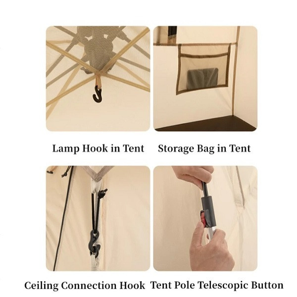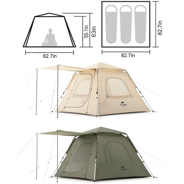 سایز دقیق باز شده محصول : 160x210x210 سانتی متر وزن چادر با متعلقات: 5.1 کیلوگرم جنس پارچه پلی استر 210T ریت آب گریزی: 2000mm جنس تیرک ها: آلومنیوم پوش: دو پوش