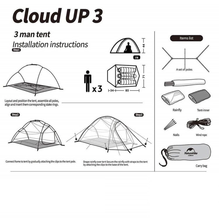 تعداد پوش: 2 مقاومت در برابر آب: PU3000 جنس پارچه خارجی: پلیاستر 210T جنس پارچه کف: پارچه 150D آکسفورد جنس توری داخلی: مش B3 جنس تیرک چادر: آلومینیوم 7001